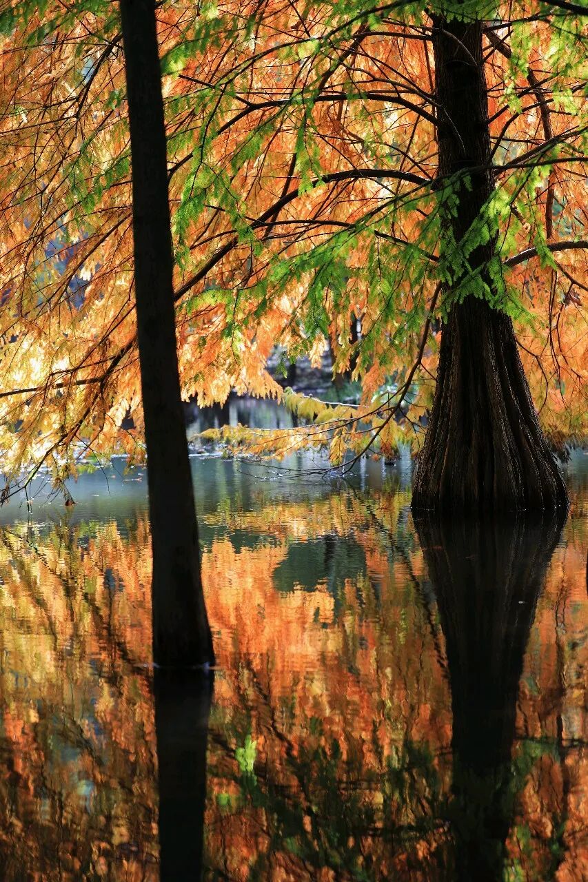 秋冬交替,不必奔赴远方,眼前的燕雀湖藏着最治愈的光影魔术。清晨的薄雾还未散尽,落羽杉林就被慵懒的阳光镀上一层柔光,纷纷扬扬的枝叶犹如羽毛般随风摆动,仿佛一场红雨瓢泼。树木倒映在澄澈的湖水中,分不清是树入画里,还是画落湖中。风一吹,在你耳畔回响的,便是紫金山秋日最动听的私语。