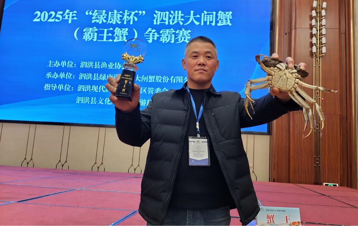 新华日报财经讯 眼下,正是大闸蟹上市的黄金季节。11月18日,2025年“绿康杯”泗洪大闸蟹(霸王蟹)争霸赛开赛,来自全县25支核心养殖基地、规模化养殖户及水产经营主体的代表携精品河蟹齐聚一堂,展开了一场集品质、规格、口感于一体的角逐。最终,575克的公蟹、430克的母蟹胜出,捧得今年的“蟹王”“蟹后”称号。