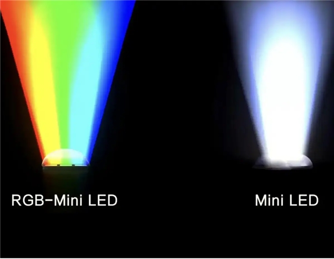 先说RGB-Mini LED,它跟普通Mini LED最大的区别在于采用红、绿、蓝三原色独立背光光源。每颗灯珠都是独立发光的,无需量子点二次转换,从背光源头直接把颜色打出来,实现了100%BT.2020高色域。不过这种高色域是在“单一颜色占主导”的画面下表现最好,比如整片红、整片绿非常艳丽,可一旦遇到复杂的、混合色繁多的电影场景,就必须三颗灯珠同时发光,再靠屏幕色阻层去过滤组合,色域在这个过程中会下降。简单来说,RGB-Mini LED的高色域不是全场景稳定的,而是单色越简单,表现越好。