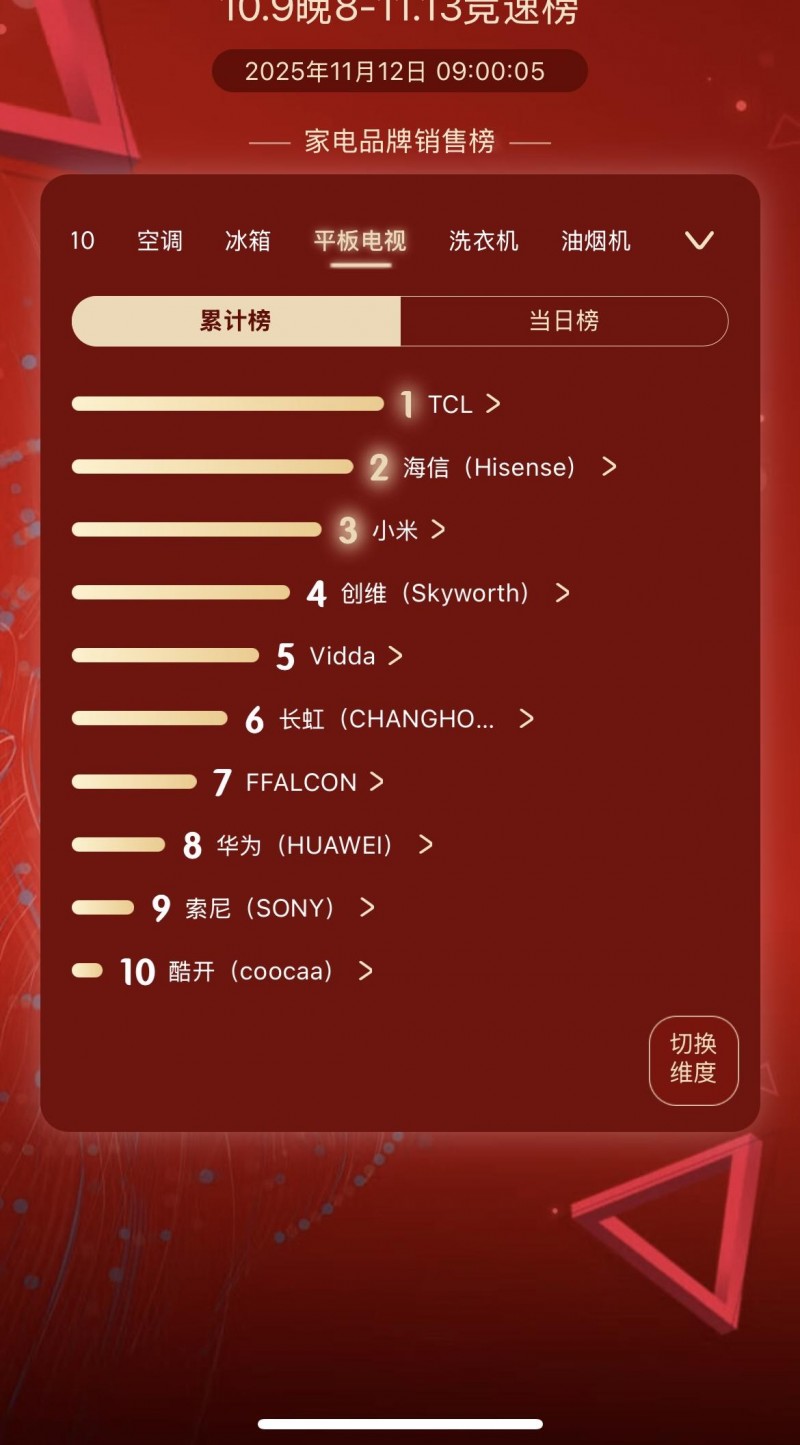 在落幕不久的双十一购物狂欢中,TCL再度交出亮眼成绩单——在京东电视竞速榜中全周期领跑,稳居榜首,与海信、小米共同占据前三席位。更值得关注的是,TCL已连续多年稳居全球TV销量前二,其中Mini LED电视更是连续两年拿下全球销量TOP1。不仅如此,根据家电权威机构奥维云网数据显示,今年前三季度它还成功摘得国产品牌销量桂冠。看到这个成绩,可能很多人会好奇:为什么TCL总是能获得这么多消费者的青睐呢?