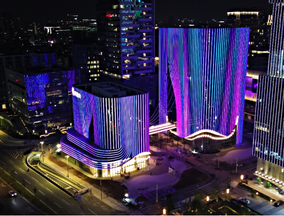 ●在街道尺度,连续而流畅的立面照明勾勒出建筑灵动的形态线条,与周边环境形成和谐有序的光影对话;