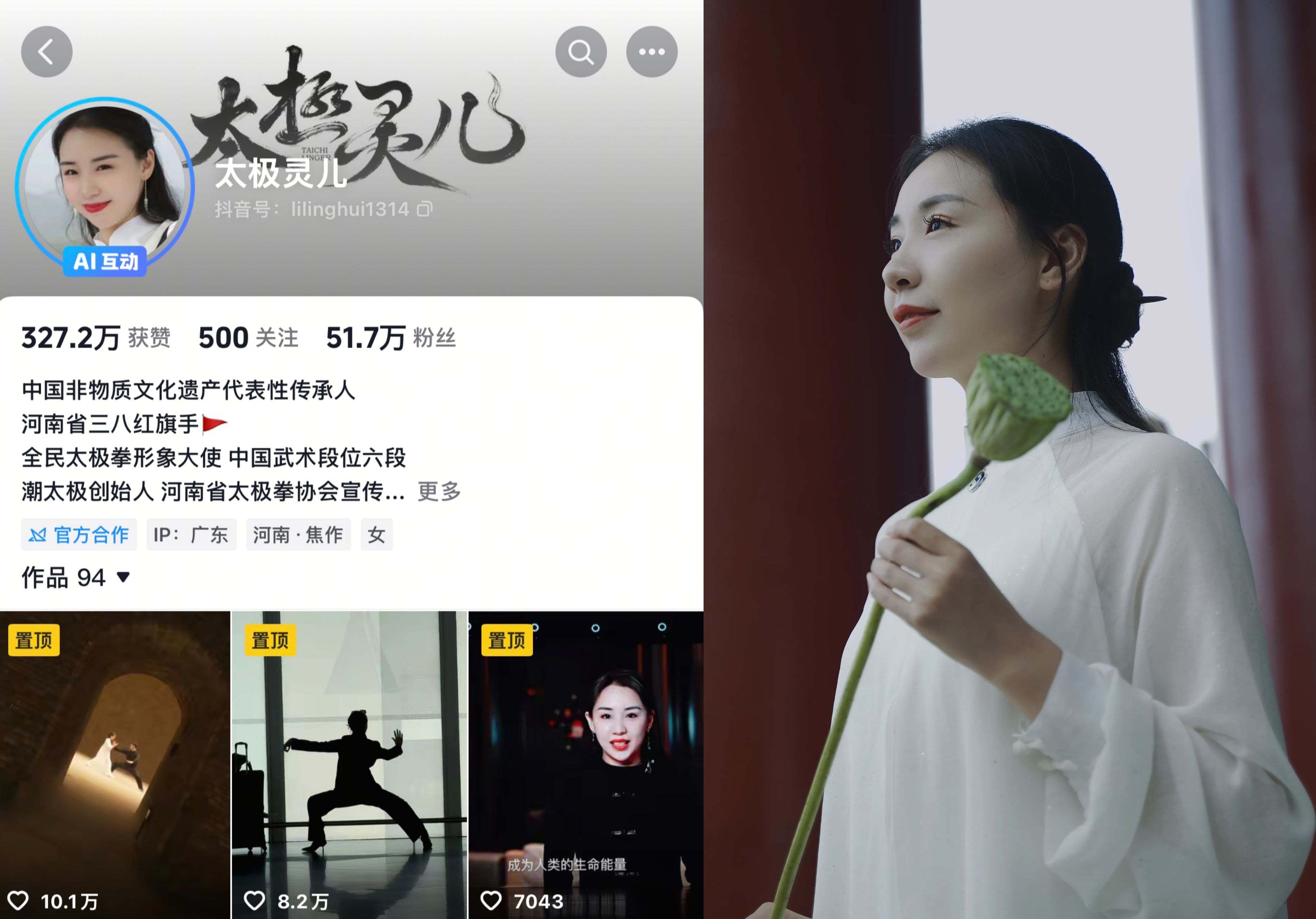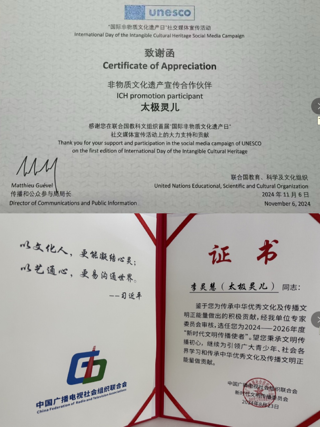 疫情期间,灵儿老师敏锐把握线上传播机遇,以现代审美重构传统太极,创新推出“潮太极”概念。她通过短视频的形式让太极哲学以时尚、亲切的形象走入大众视野,全网吸引近50万粉丝关注。随着线上影响力的与日俱增,她始终坚守传承根基,开创性地开展线上线下联动研学,成功构建了“线上传播吸纳、线下深度体验”的完整闭环,促进了当地文旅融合发展,更让古老的太极文化在当代焕发出新的生机与活力。