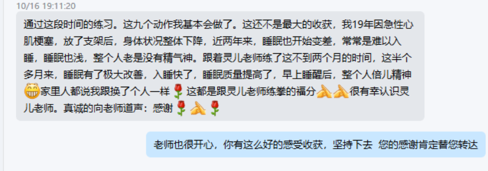 教学成果在用户身上得到了最真实的印证。一位跟随灵儿老师练习不到两个月的学员分享道:“以前睡眠不好,白天总没精神。跟着灵儿老师练了这不到两个月的时间,睡眠质量明显提高了,早上睡醒后,整个人倍儿精神!”这样的反馈,在简橙教育的太极学员中并非个例。