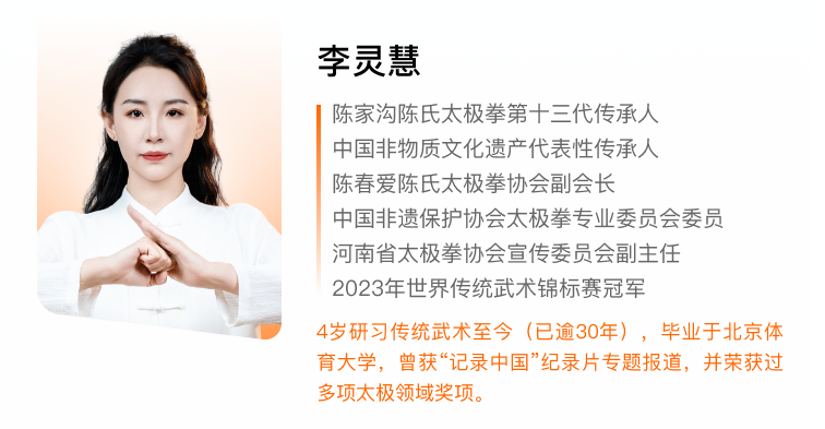 灵儿老师出身于太极拳发源地——河南温县陈家沟的武学世家,自幼沉浸陈氏家族武学传统,毕业于北京体育大学民族传统武术专业,兼具陈氏太极拳正统背景与现代专业运动科学理论,是当代太极拳领域少有的“正统+科班”双料传承人。独特的经历让她对太极拳的理解超越了单纯的招式,而是将其升华为一门融合身体智慧与生命哲学的艺术。