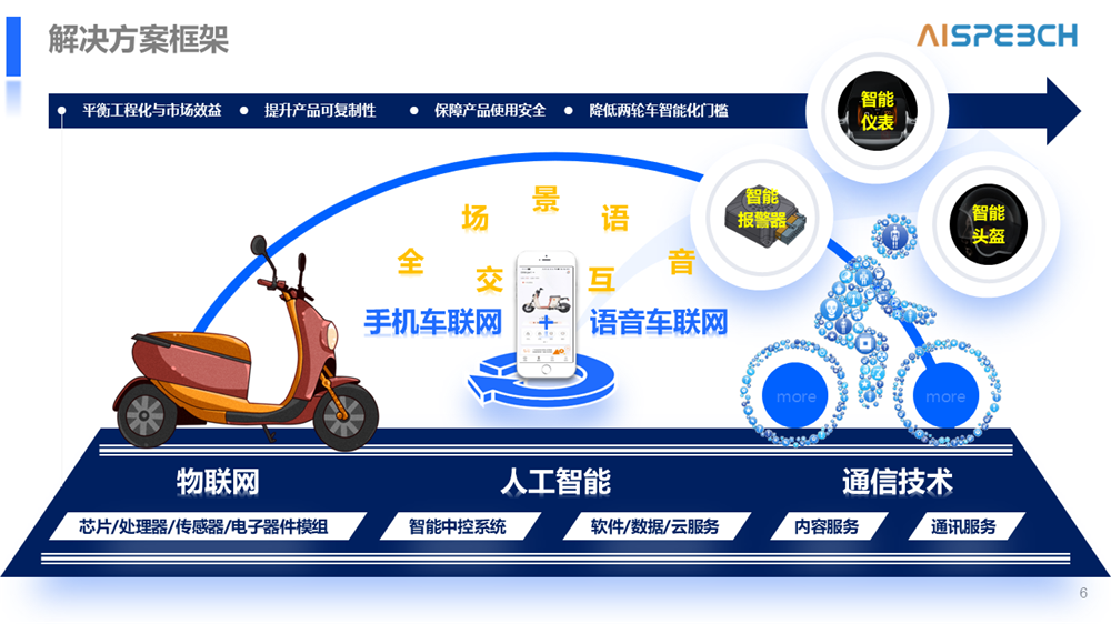 思必驰基于人工智能、物联网及通信技术,推出了以平衡工程化与市场效益、提升产品可复制性为定位的两轮电动车智能化解决方案,融合手机车联网与语音车联网,以语音交互为入口,在提升骑行安全的同时使两轮电动车实现车辆智能、车控智能和数据智能,助力两轮车厂商智能化升级。
