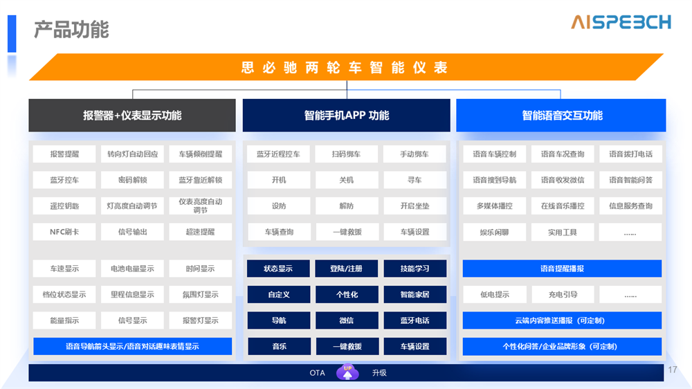 其中,思必驰两轮车专用智能仪表不仅提供报警器+仪表显示功能、智能手机APP控车功能及智能语音交互功能,还整合AI大模型以及全屏导航、AI电话等功能,为用户提供更加智能、便捷、安全的两轮电动车出行体验。