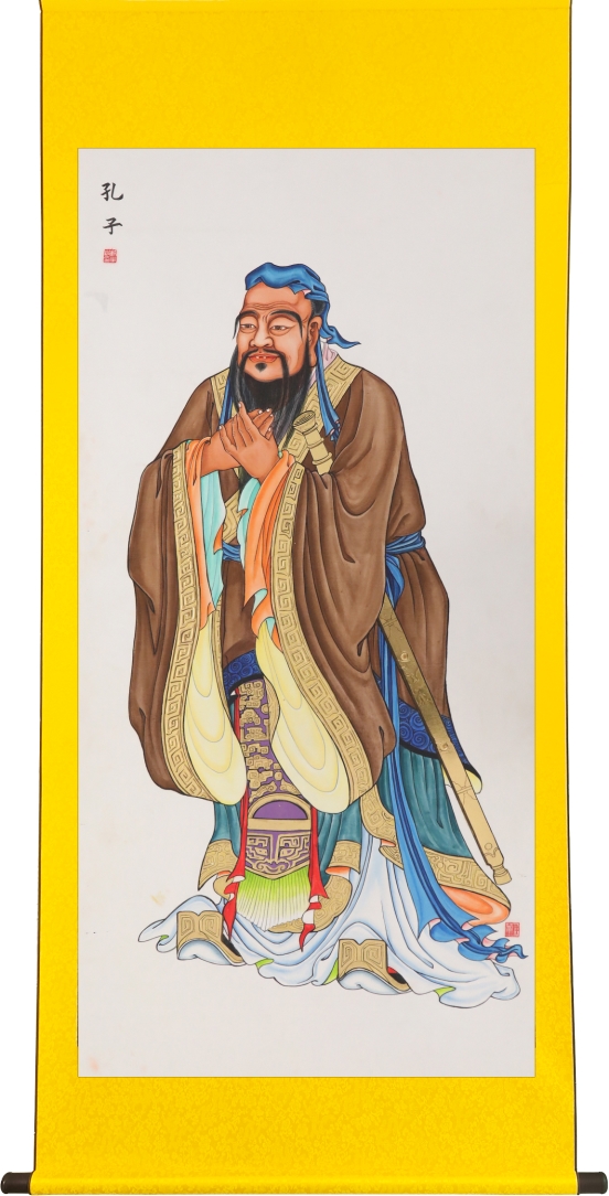 柔和的射灯缓缓亮起,工作人员戴着手套,小心翼翼地将一卷丝绢年画从锦盒中取出。随着丝绢逐渐展开,画面中身着深衣的孔子拱手而立,眉宇间的温润与袍袖上流转的金线交相辉映,仿佛跨越千年的圣贤正缓缓走出画卷。