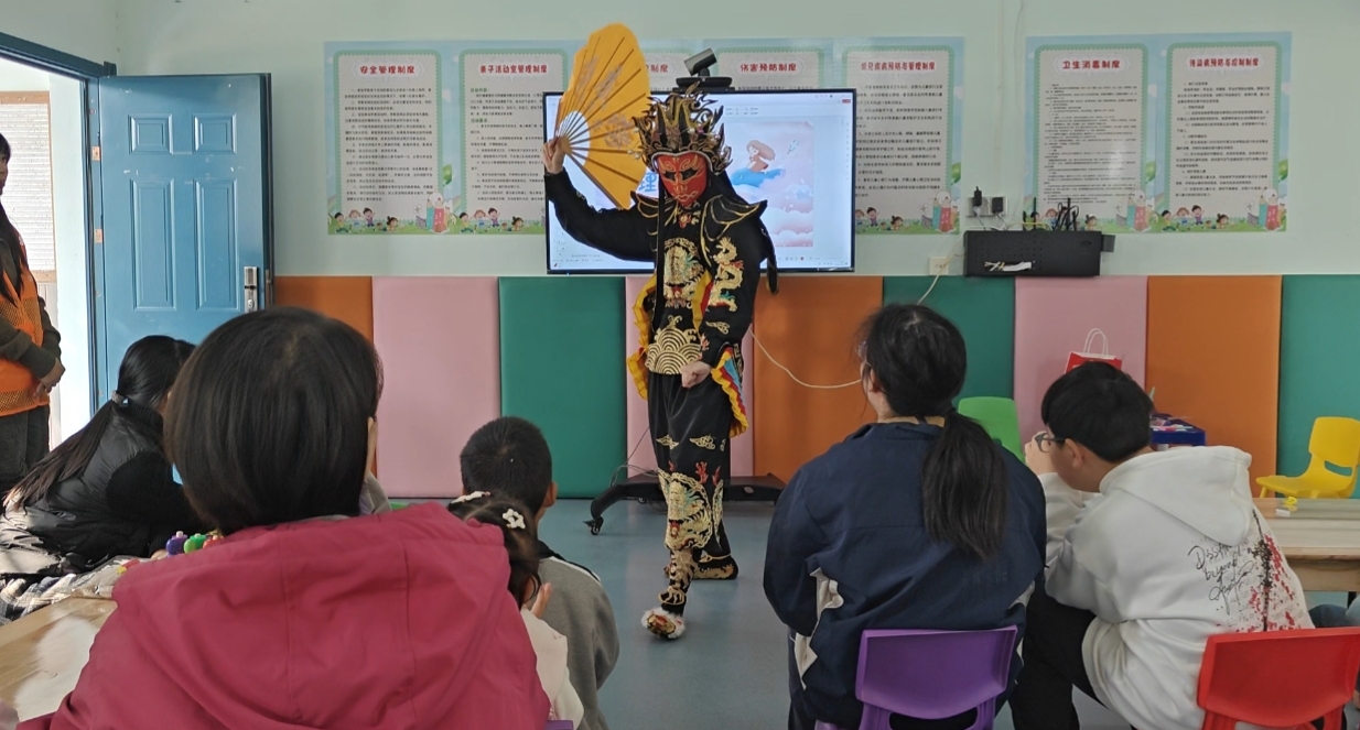 随后,活动迎来高潮——川剧变脸表演震撼登场。表演者步伐矫健,在疾徐有致的乐声中,挥袖、转身、回首间,脸谱变幻莫测,引得孩子们惊叹连连。当表演者走入人群进行近距离互动时,魔术般的变脸绝活更是引发了阵阵掌声与欢呼,将现场气氛推向顶点。