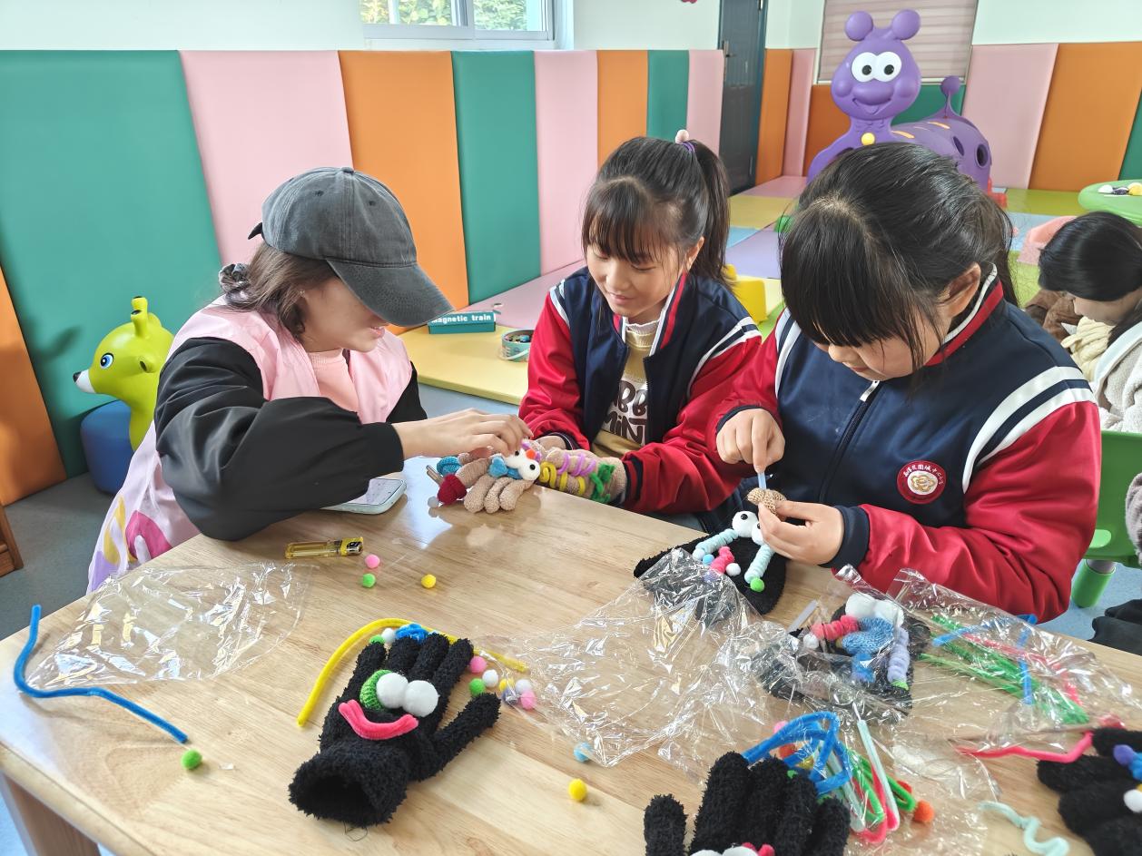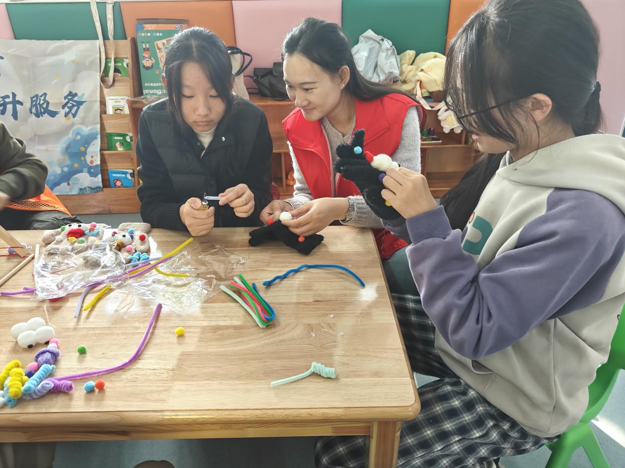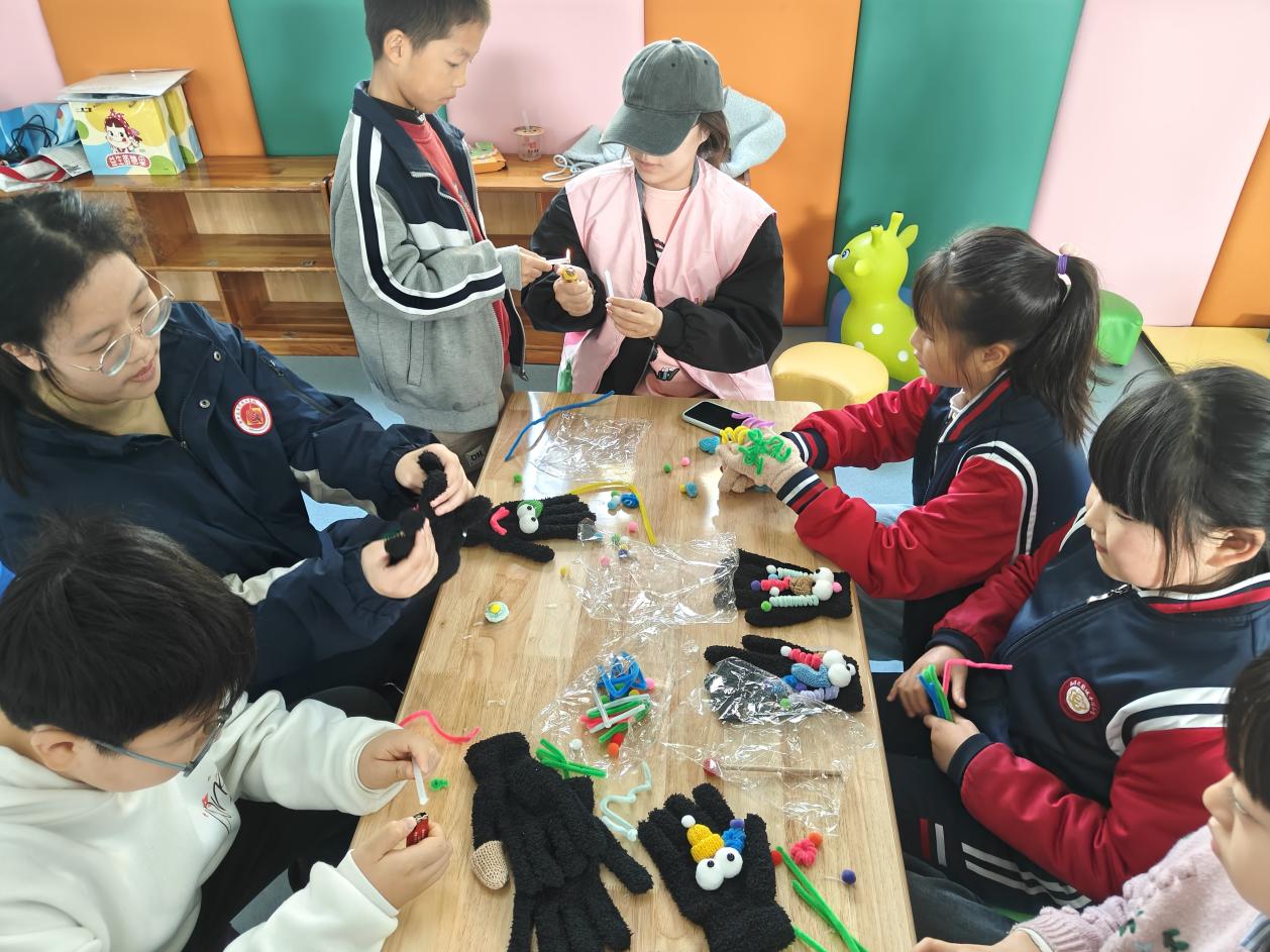 活动上半场,孩子们在志愿者指导下投入“奇幻手套”的创作。彩色扭扭棒、毛球等材料在他们手中变成了充满奇思妙想的作品,现场气氛热烈而温馨。手工活动不仅锻炼了孩子们的动手能力,更激发了他们的创造力和想象力。
