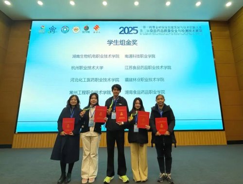 河北化工医药职业技术学院质量检测与管理系学生常伊飒、张雲杰、刘亚楠在崔润丽、张铎、李毅丽三位教师的指导下,凭借扎实的专业基础、规范的实验操作和出色的团队协作,最终夺得金奖,展现了学校师生优秀的专业技能与精神风貌。