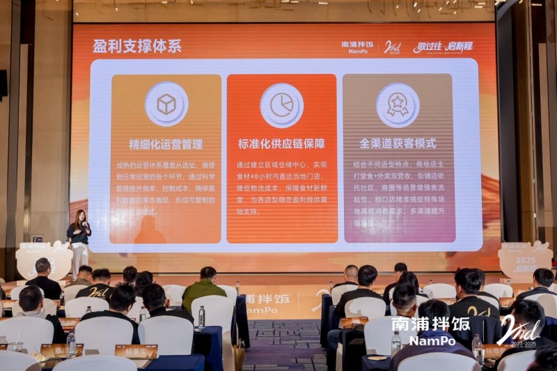 在招商总监的主持下,多位加盟商分享了与南浦拌饭合作的真实体验。来自厦门的加盟商许先生表示:"南浦拌饭是拌饭赛道里的一匹黑马"。来自福州的叶女士也提到:"加盟南浦很靠谱"。这些来自市场一线的声音,生动印证了南浦拌饭商业模式的可行性与团队支持的可靠性。