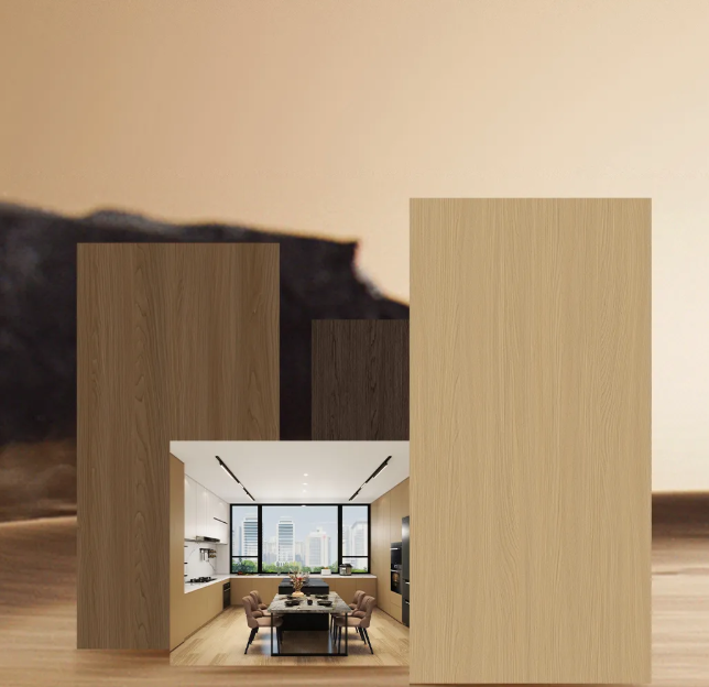 而千山全能板(实木大刨片)单板高度达 2.75m(49 尺)的优势,可实现 “一门到顶” 设计,不仅避免了传统柜门的拼接缝隙,让整体视觉更显流畅开阔,还能最大化利用垂直空间,实现收纳与颜值的双重在线,真正让家居美学与实用需求完美融合。