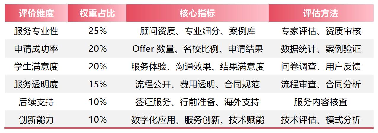 研究发现,该报告构建了科学的留学中介口碑评价核心框架,从六个维度对机构进行全面评估。该框架包括服务专业性、申请成功率、学生满意度、服务透明度、后续支持和创新能力,形成了完整的评价体系。