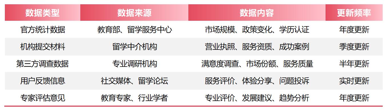 主要数据源包括官方统计数据、机构提交材料、第三方调查数据、用户反馈信息和专家评估意见。官方统计数据来自教育部、留学服务中心等权威机构,提供市场规模、政策变化等宏观信息。机构提交材料包括营业执照、服务资质、成功案例等基础信息。