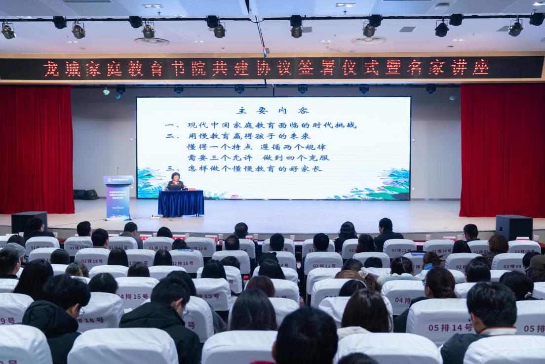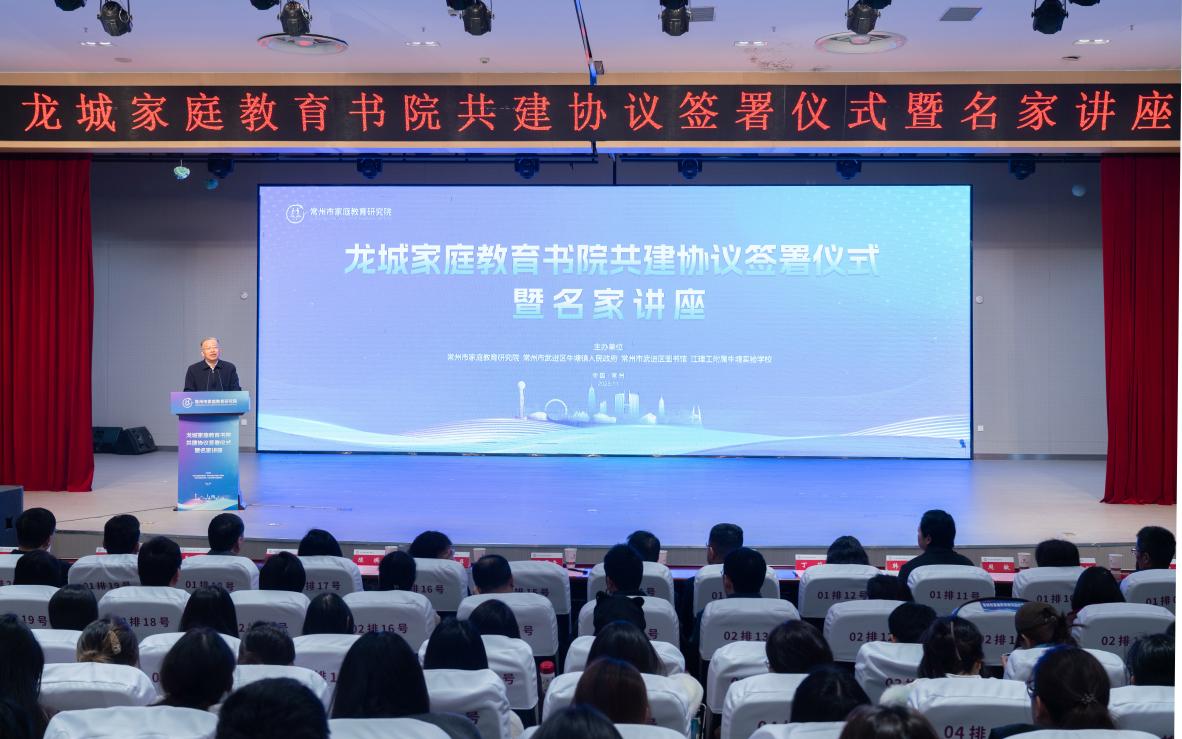 11月22日上午,常州市武进区江理工附属牛塘实验学校报告厅内座无虚席,由常州市家庭教育研究院联合牛塘镇人民政府、武进区图书馆及江理工附属牛塘实验学校共同主办的龙城家庭教育书院共建协议签署仪式暨名家讲座在此举行。中国高等教育学会家庭教育学专业委员会名誉理事长、《中国教育报》首席家庭教育专家、教授赵石屏,江苏理工学院党委书记崔景贵,党委常委、宣传部部长王斌,常州市委教育工委书记司马双龙,常州市妇联党组书记、主席陈瑛,武进区副区长张小虎,常州市教育局副局长俞群祥,常州市妇联副主席丁莉,武进区教育局局长周敏,常州市家庭教育研究院专家成员、市内部分机关单位负责同志、家长代表以及江苏理工学院师生代表等500余人参加活动。