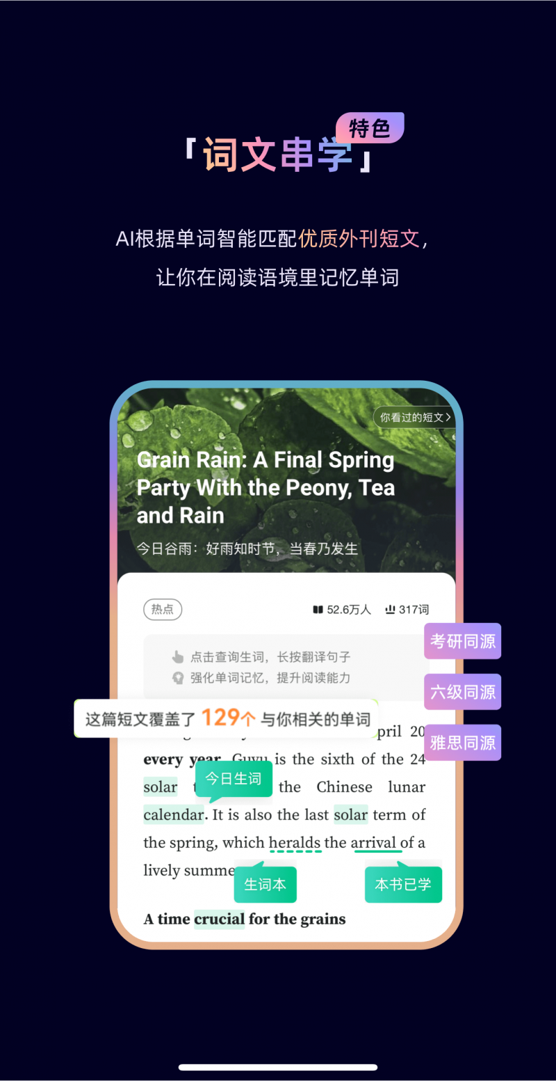 高效亮点:突破普通语境助记的局限性,通过同源外刊与难度适配,让背词与阅读能力提升高效联动。