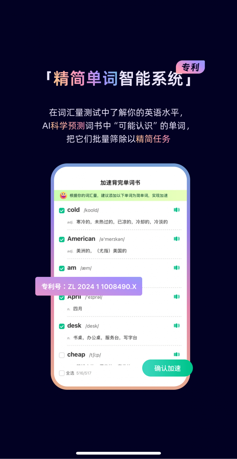 •采用专利技术(专利号:ZL 2024 1 1008490.X),通过词汇量测试精准预估用户水平;