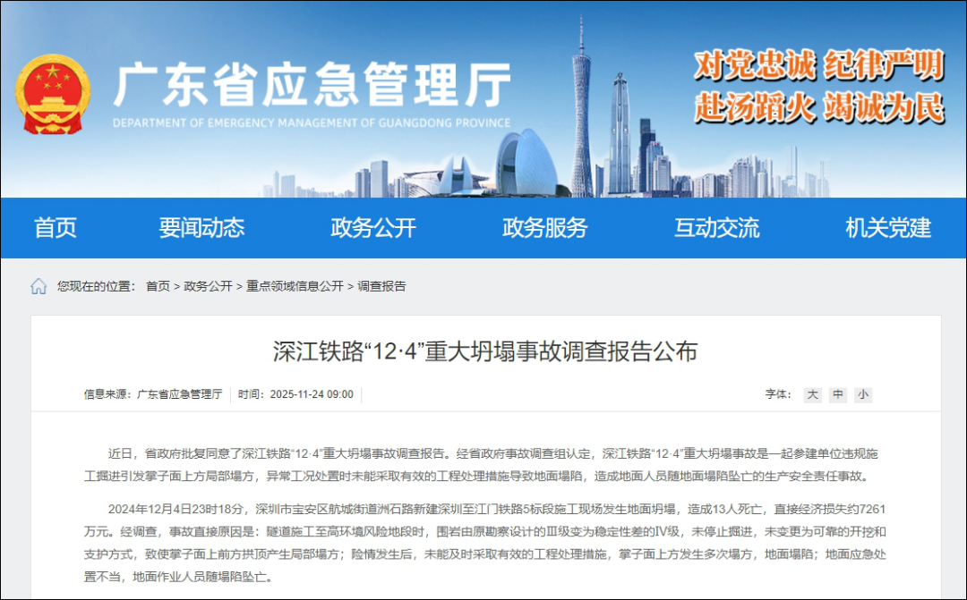 11月24日,广东省应急管理厅公布《深江铁路“12·4”重大坍塌事故调查报告》。