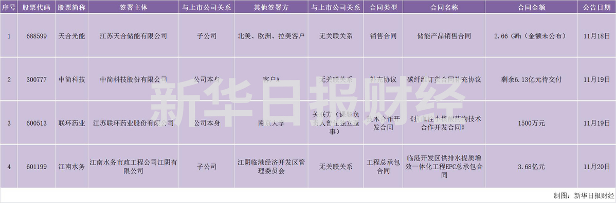 11月17日——11月23日,江苏上市公司公布了哪些重大合同?一起来看。