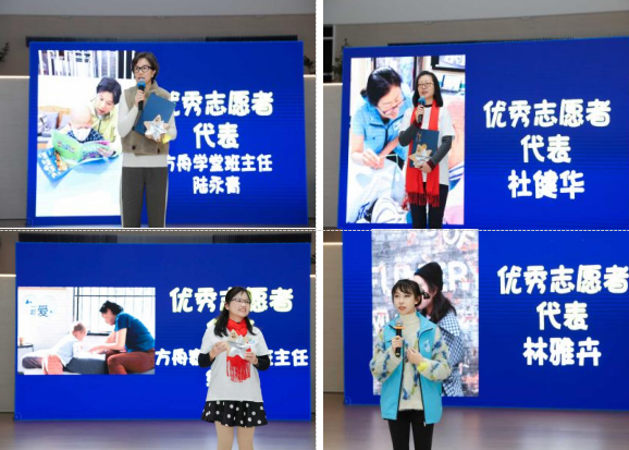 获奖代表们分享了他们在志愿服务中的深刻体悟。方舟之家志愿者代表陆永青认为"爱不止于同情,更是双向的照亮";方舟多加志愿者代表杜健华则将服务比作"爱的循环",“我们付出爱,也从病患的坚强中收获感动和力量,作为设计师志愿者代表的林雅卉则通过病童的疼痛独白领悟到:“我放弃了追求视觉冲击的商业思路,转而采用铭恩小朋友写下的疼痛独白作为核心元素。那一刻我才真正明白,‘用心’才是最好的设计答案。”这些质朴的言语,道出了志愿者们最真实的感动,也让现场观众见证了爱的多重维度。方舟家长学堂班主任纪君美老师因故未能出席,由工作人员代为领奖,感谢她多年来对病童家长的悉心陪伴与付出。