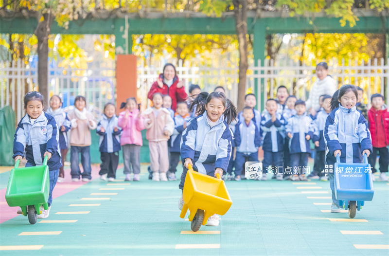 11月19日,宿迁市宿城区河滨街道府苑幼儿园组织小朋友参加滚轮胎、小车竞速、多人协作滚筒车等趣味运动,锻炼身体,丰富校园生活。徐江海 摄 视觉江苏网供图