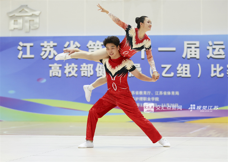 11月18日,江苏省第二十一届运动会高校部健美操(乙组)比赛在江苏护理职业学院举行,来自常州工程职业技术学院、江苏财经职业技术学院、南京工业职业技术大学等29所院校的约500名运动员,参与男子单人操、女子单人操、混合双人操等项目比赛。赵启瑞 摄 视觉江苏网供图