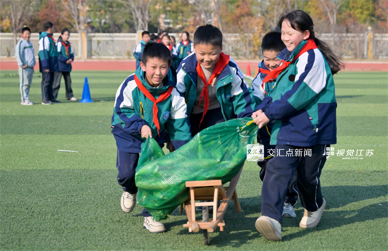 11月21日,宿迁经济技术开发区富民路实验学校举办农耕趣味运动会,开展捡玉米竞速、独轮车运玉米、扁担挑玉米等趣味比赛项目,让学生在欢快的竞技中体验传统农耕文化,养成珍惜粮食的习惯。黄松 摄 视觉江苏网供图