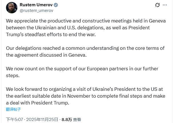 乌克兰国家安全与国防委员会秘书乌梅罗夫25日在社交媒体上发文,称美乌双方代表团已就在日内瓦讨论的协议的核心内容上,达成一致