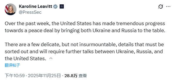 美国白宫新闻秘书莱维特25日发布声明称:“还有一些棘手但并非不可克服的关键细节亟待解决“。