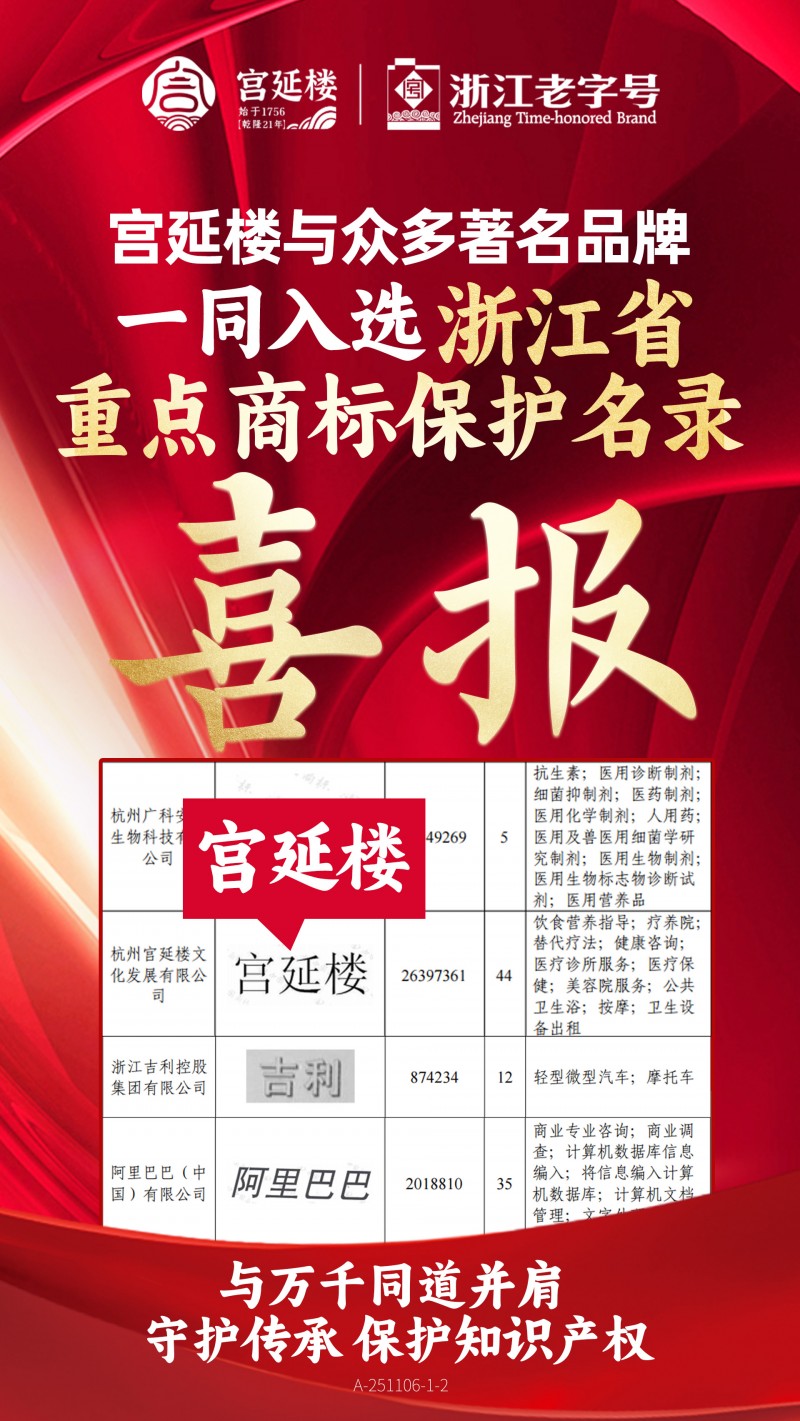 近日,浙江省市场监督管理局正式发布《浙江省重点商标保护名录》的公告,共有42家杭州老字号入选名录。"宫延楼"成功入选,成为杭州老字号中获此殊荣的品牌之一。这一荣誉不仅是对宫延楼近年来创新发展的肯定,更是对其在传承中华优秀传统文化、推动老字号复兴方面所作贡献的认可。