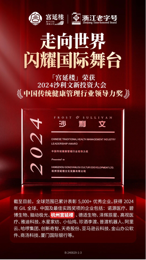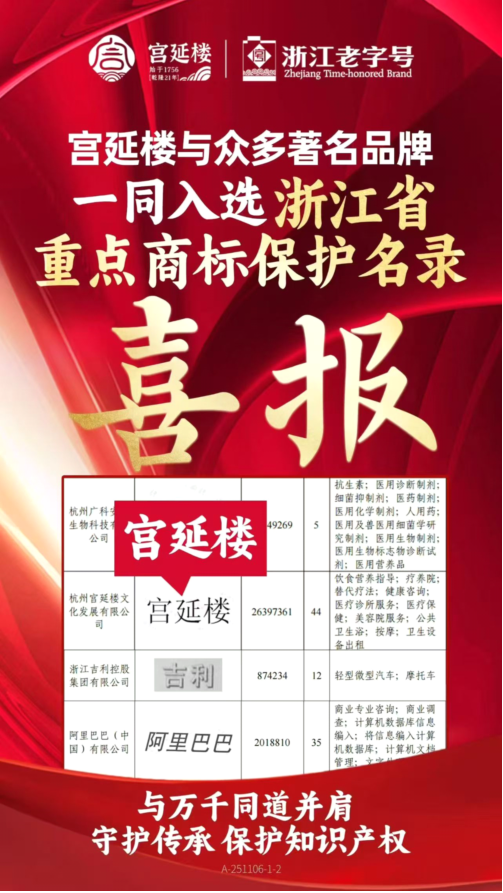 此次入选浙江省重点商标保护名录,标志着宫延楼在知识产权保护与品牌国际化进程中迈出关键一步。未来,宫延楼将继续以创新为驱动,守护文化根脉,激发市场活力,为中国大健康产业的高质量发展贡献力量。