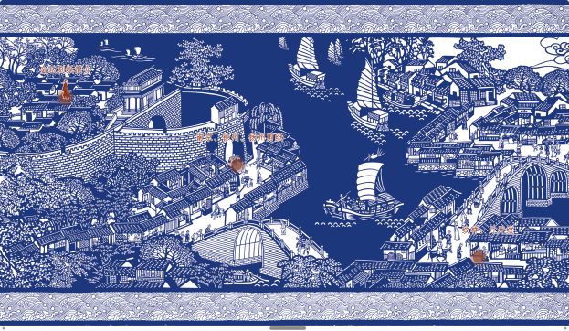 在金坛刻纸数字体验现场,学生们只需轻触屏幕,原本静态的百米刻纸长卷《大运河》瞬间“苏醒”:纤夫开始拉纤,商旅沿河而行,整幅运河画卷在交互屏上焕发出全新生命力。更令人惊叹的是,学生们可以通过手指在屏幕上自由勾勒路径,让刻纸人物沿着设定的路线行走,仿佛穿越时空重演千年运河故事。这一创新设计紧密围绕刻纸“计白当黑”的美学逻辑,将传统技艺中的阴阳虚实转化为可交互的动态体验。
