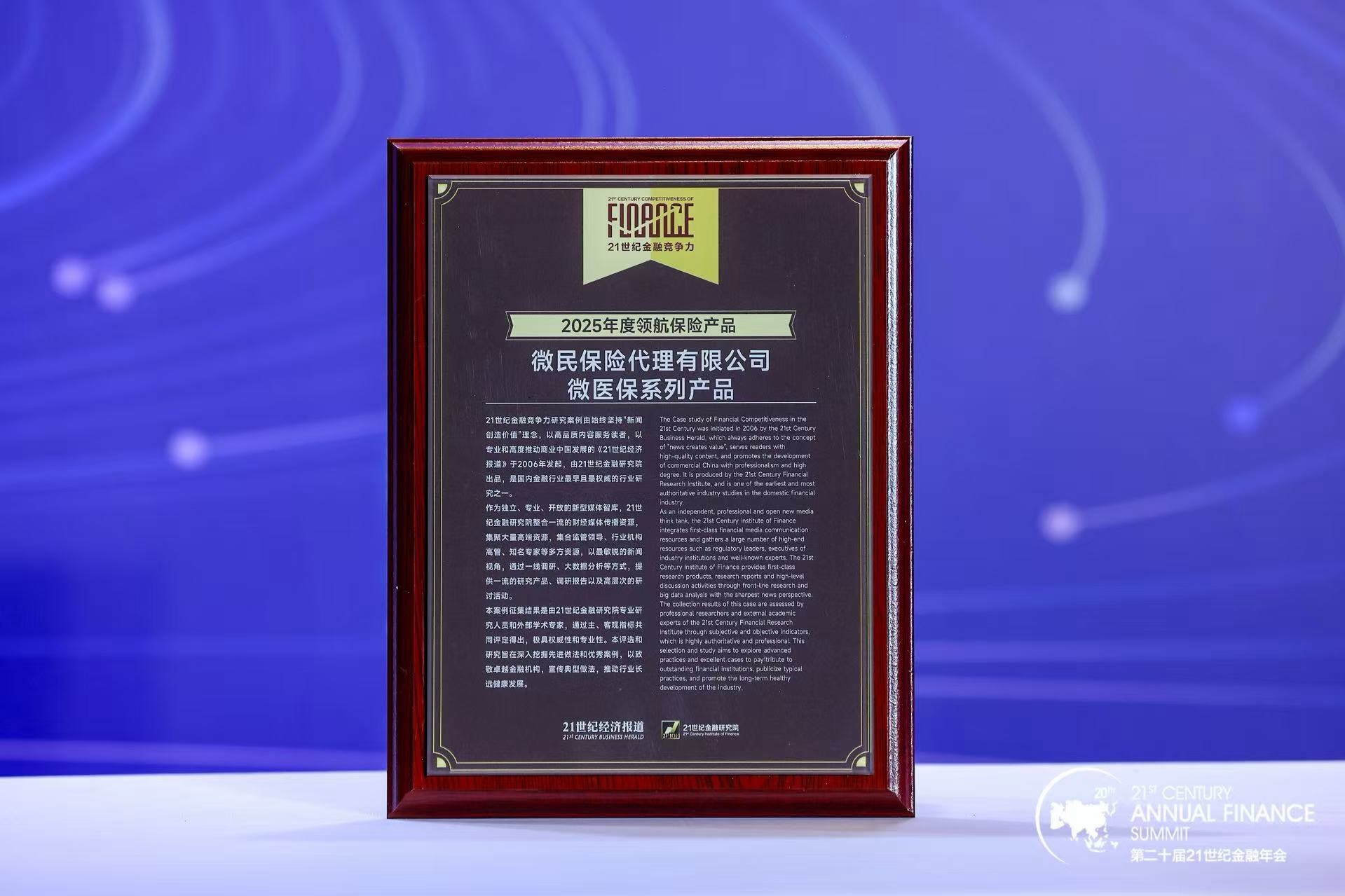近日,由《21世纪经济报道》发起、21世纪金融研究院出品的“2025年21世纪金融竞争力优秀案例”评选活动揭榜,腾讯官方保险代理平台——腾讯微保的“微医保”系列产品荣登“2025年度领航保险产品”榜单。