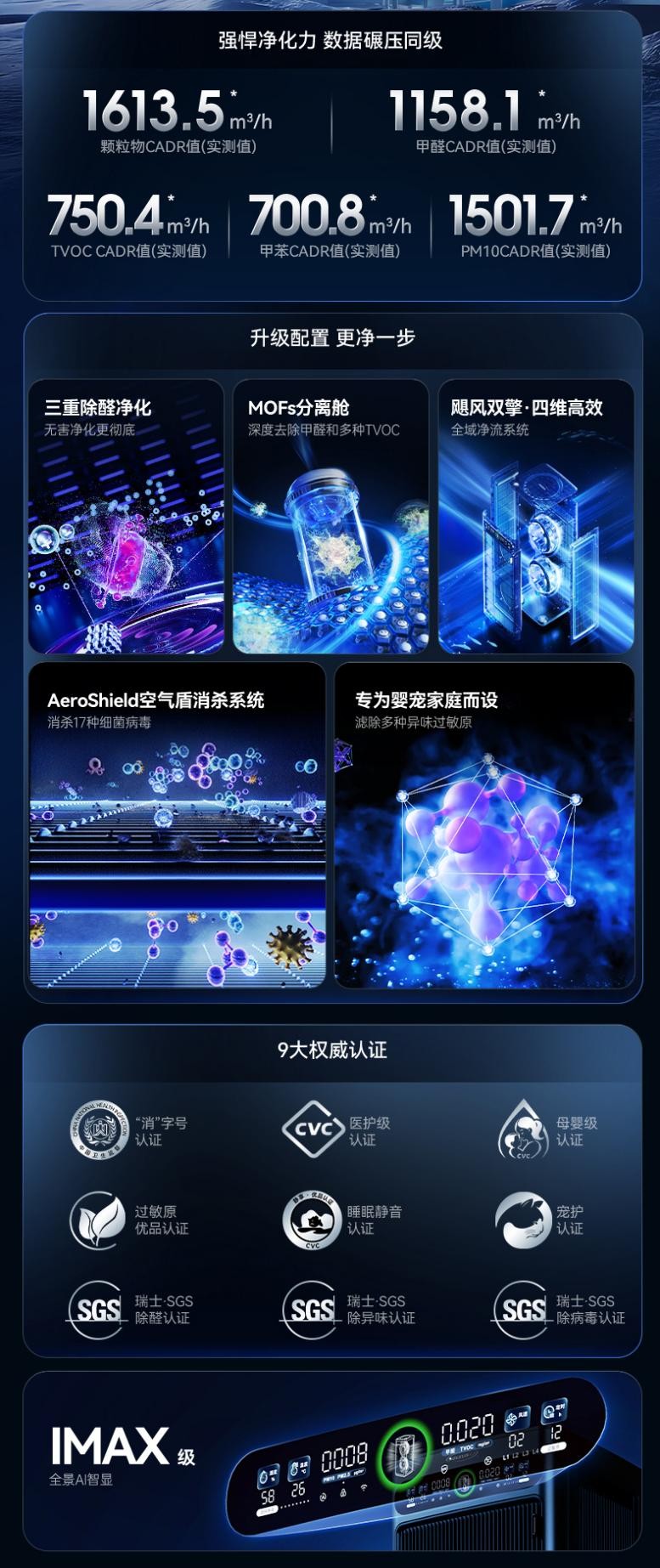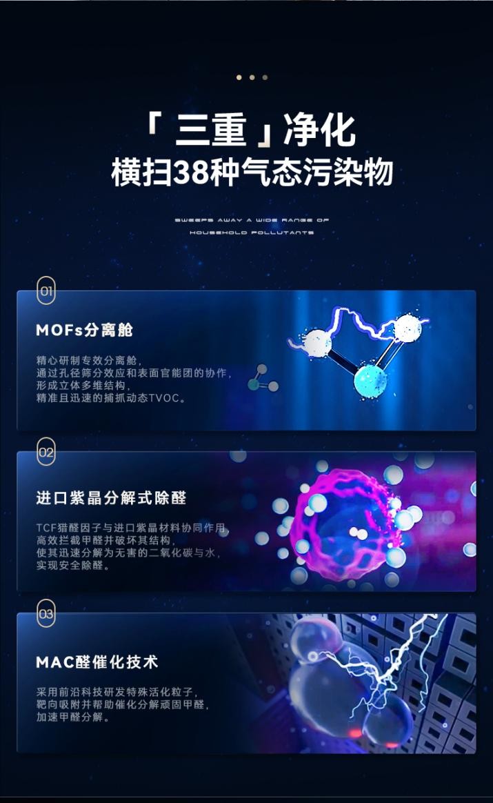 全效净化性能,构筑全屋健康屏障:舒乐氏G20在滤网设计、净化效率、除醛、除菌、除异味性能、空气质量检测等多个方面上进行了全新升级,是行业内首款应用MOFs材料的高端空净产品,并配置MAC醛催化、分解式除醛紫晶、AeroShield空气盾等创新品牌独有空气净化技术,强效分解去除甲醛、甲苯、TVOC、宠物猫狗等多种过敏原、多种病菌、PM2.5、异味等多种空气污染物,实现全维度空气净化性能。