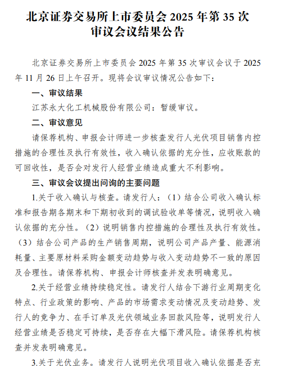 新华日报财经讯 11月26日上午,北京证券交易所上市委员会召开2025年第35次审议会议,江苏永大化工机械股份有限公司(下称“永大股份”)的IPO申请被作出“暂缓审议”决定,成为北交所2025年度首家遭遇暂缓的IPO项目。