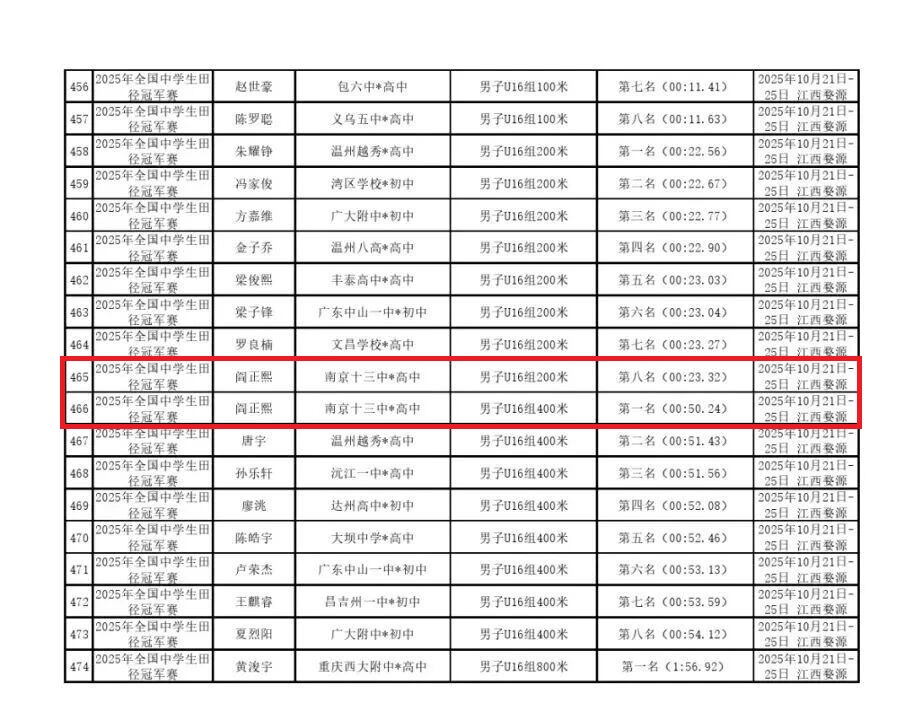 同样来自十三中的阎正熙在U16男子400米比赛中,凭借出色的节奏掌控与强大的后半程能力,勇夺第一。此外,还在U16男子200米比赛中跻身决赛,获得第八,展现出全面的短跑实力。