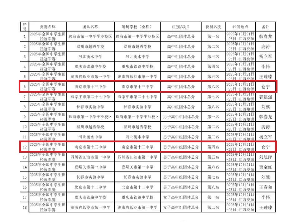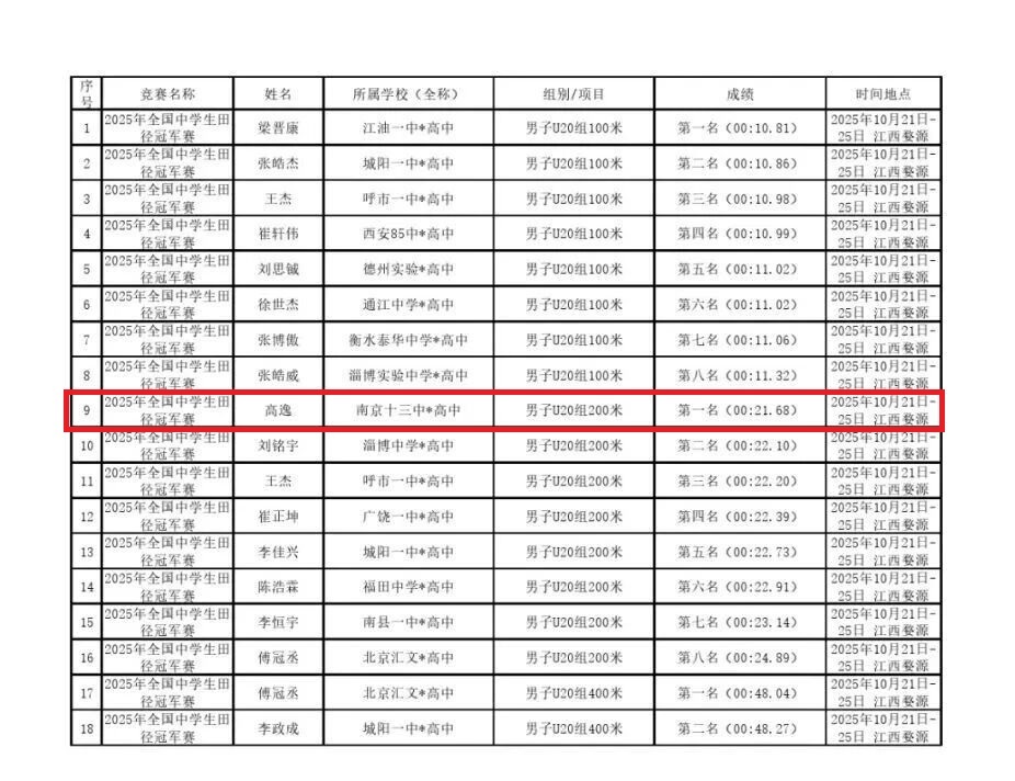 其中,南京市第十三中学田径队夺得三项全国冠军,并刷新一项赛会纪录;江苏省新海高级中学学生赵涵硕以21.81 秒的成绩不仅摘得全国冠军,更超越国家一级运动员标准;南京市金陵中学学生张俊一虽然不是体育特长出身,却以黑马之姿驰骋赛场,在与顶尖选手的较量中夺得跳高项目全国第五……