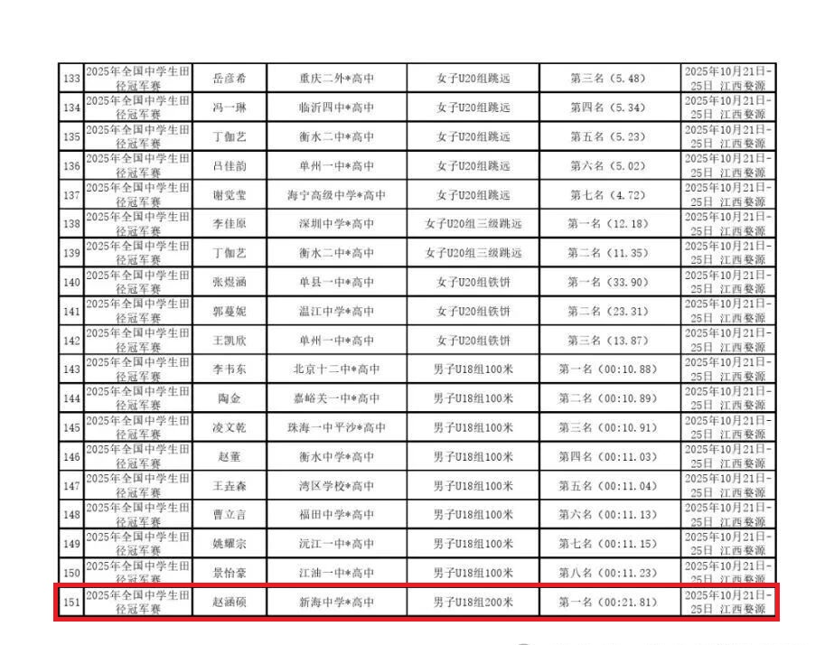 男子 200 米赛道上,来自新海高级中学学生赵涵硕的身影格外耀眼。从预赛突围、复赛晋级到决赛冲刺,他顶住多轮鏖战的压力,最终以21.81 秒的惊人成绩冲过终点线,不仅强势摘得该赛事项目的全国冠军,更一举超越 21.95 秒的国家一级运动员标准,同时刷新了个人最佳战绩。