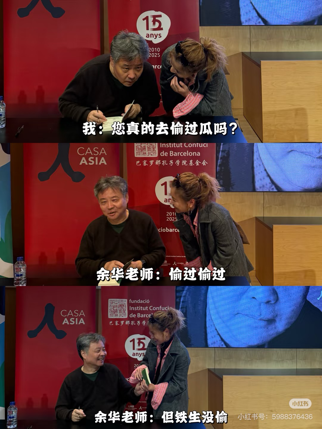 问完莫言问余华,大家就是这么穷追不舍。关于莫言、余华拉着史铁生偷瓜的事,莫言20日晚刚在香港辟完谣:“这肯定是一个虚构的故事情节,网友是在编一个他们感觉到很开心的故事。”转头余华就在西班牙承认上了:“偷过偷过,但铁生没偷。”这对文坛CP的相处趣事再添一笔。