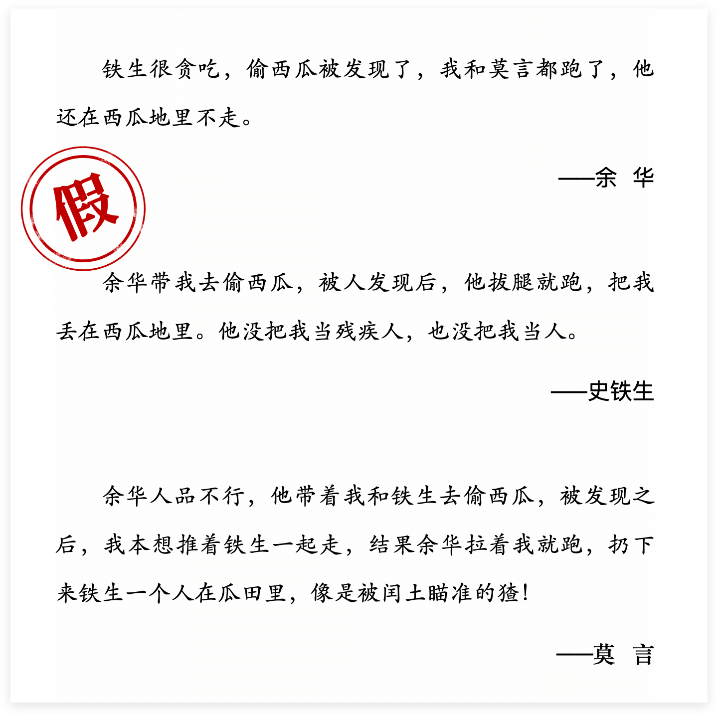 莫言否认、余华承认,表面上看各执一词,其实,两个人的说辞完全对得上账——莫言没有否认偷瓜的事,否认的是“没有拉着史铁生”、不是三人一起去;余华承认有偷瓜的事,但是“铁生没偷”,两人说的是一回事。在莫言和余华的作品中也能找到关于这件事的书面陈词。