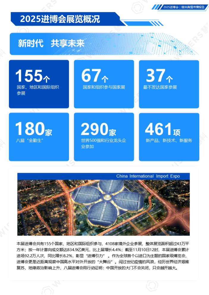 慧科讯业《2025进博会舆情报告》显示,本届进博会聚焦AI技术应用与落地展示,来自全球的新产品、新技术云集,参展企业共带来超400项新产品、新技术、新服务。