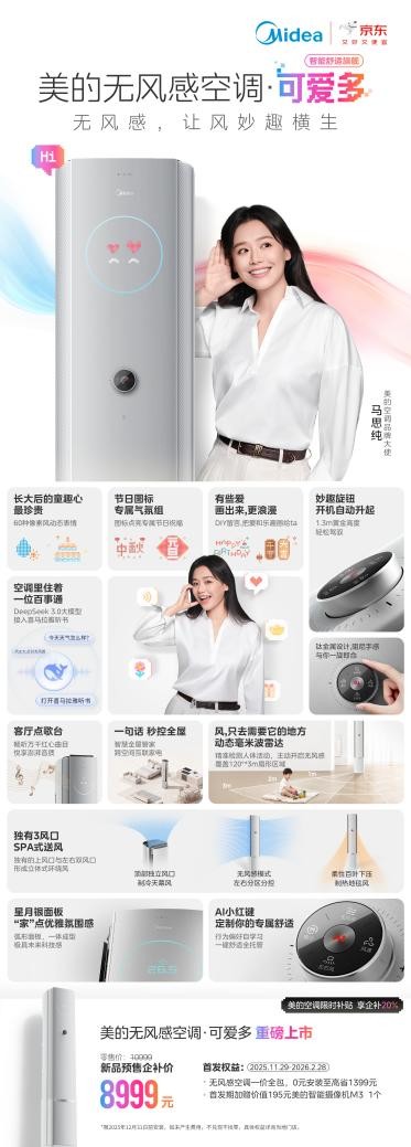 美的无风感空调·可爱多已于11月22日在京东MALL及京东电器城市旗舰店开启预售,并于11月29日重磅上市。此次品牌特邀实力派演员马思纯担任品牌大使,她始终以温暖细腻的形象传递生活中的治愈力量,这与美的无风感空调·可爱多“用科技守护家庭情感、传递生活温度”的核心理念高度契合。明星背书与产品价值的深度绑定,让这款高端情绪空调更添星光质感,也让美的无风感空调·可爱多作为行业首款的情绪空调定位深入人心。
