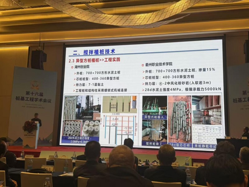 王卫东大师还列举了异型种植桩的两项工程实践,在湖州产业园项目中,现场静载试验抗压检测值是理论计算值的1.88倍,30天水泥土原位取芯强度达到3MPa以上;在衢州职业技术学院项目试桩中,28天水泥土强度达到4MPa,极限承载力5000kN。