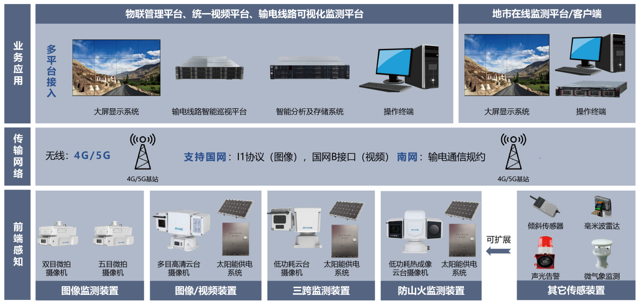 系统全面支持国网、南网标准接口,可灵活接入高清摄像头、红外测温设备、无人机等多种终端设备,实现各类监测数据的统一汇聚与采集;网络层构建稳定可靠的传输通道,确保监测数据实时、无延迟上传至业务应用层;业务应用层则集中实现告警信息展示、处理工单流转、数据报表生成等功能,为运维决策提供全流程、全链条支撑。