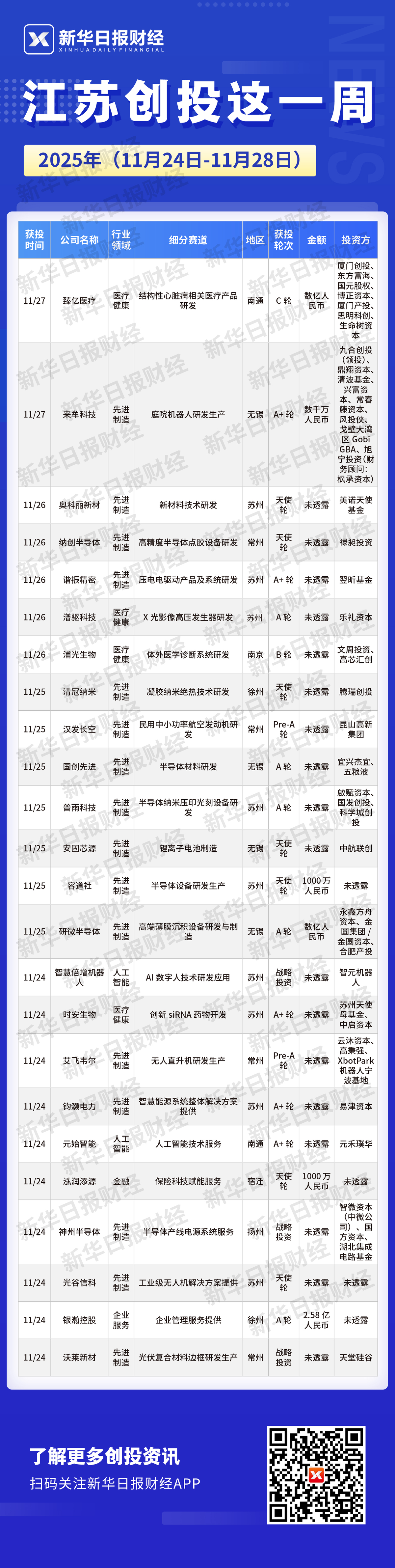 江苏本地方面,11月26日,省科技厅公布2025年度45家标杆孵化器名单,全省标杆孵化器由此达到77家。新增的45家孵化器聚焦“硬科技”,探索新型孵化模式,累计搭建100多个专业技术服务平台,孵化企业5800余家。此外,11月28日,江苏农垦现代生物技术产业投资基金成立,出资额10亿元。该基金由省农垦集团、省战新母基金、南京江北新区产业基金等共同出资,重点投向生物育种、生物制造、生物医药等领域。
