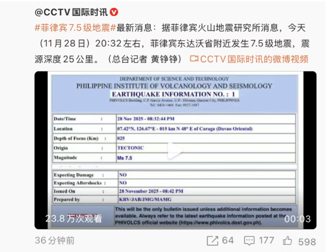 据@CCTV国际时讯 11月28日消息,菲律宾误报7.5级地震:据总台记者了解,目前菲律宾火山地震研究所已将有关“菲律宾东达沃省附近7.5级地震”的报文从其官方网站上撤掉。(总台记者 黄铮铮)