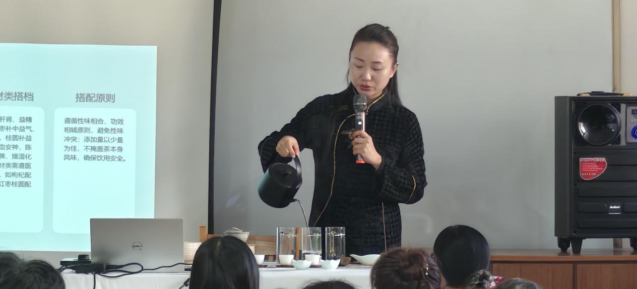 课程伊始,王煜讲师先梳理茶叶基本特点与主要种类,帮助学员建立对茶的基础认知。随后,她结合时间、季节变化,详解了日常选茶原则及背后依据,并针对老年人常见健康困扰,分享实用“茶疗方”与养生茶搭配技巧,让茶叶健康益处充分发挥。这些方法简单易行、贴近老年人生活需求,引发了学员们的浓厚兴趣。