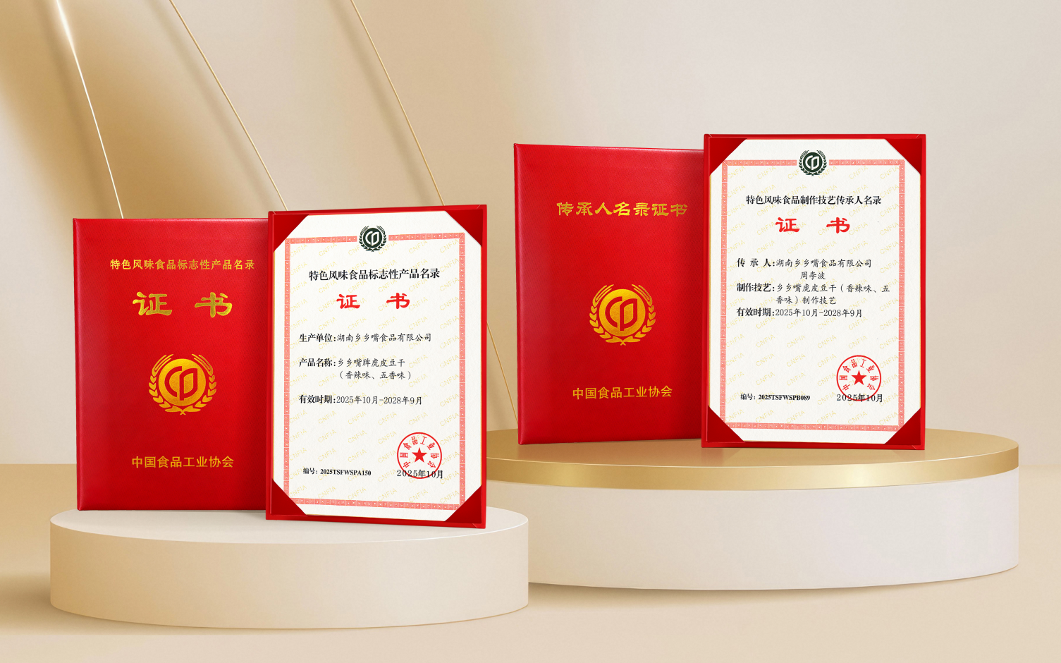 2025年11月12日,在兴化举办的全国特色风味食品产业高质量发展大会上,中国食品工业协会正式公布第二批特色风味食品标志性产品及制作技艺传承人名录。乡乡嘴凭借深厚的武冈非遗工艺积淀与鲜明的地域风味,其核心产品“虎皮豆干”成功入选“特色风味食品标志性产品”,创始人周李波获评“特色风味食品制作技艺传承人”。