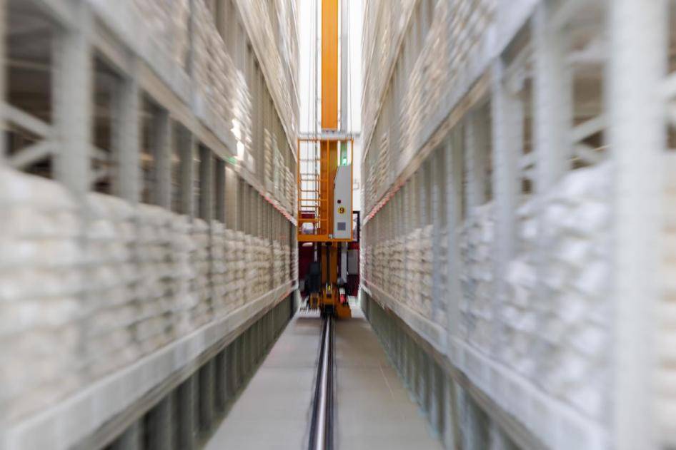 仓储环节中,智能立体仓库是仓储周转核心枢纽,12层高自动化立库库容 1.2万吨,自动堆垛机、自动翻垛机等自动化设备及智能化系统与WMS系统协同运作,系统智能分配货位、堆垛机自动存取,实现库存实时更新与账实同步,大幅提升仓储效率,满足规模化存储与灵活调配需求。