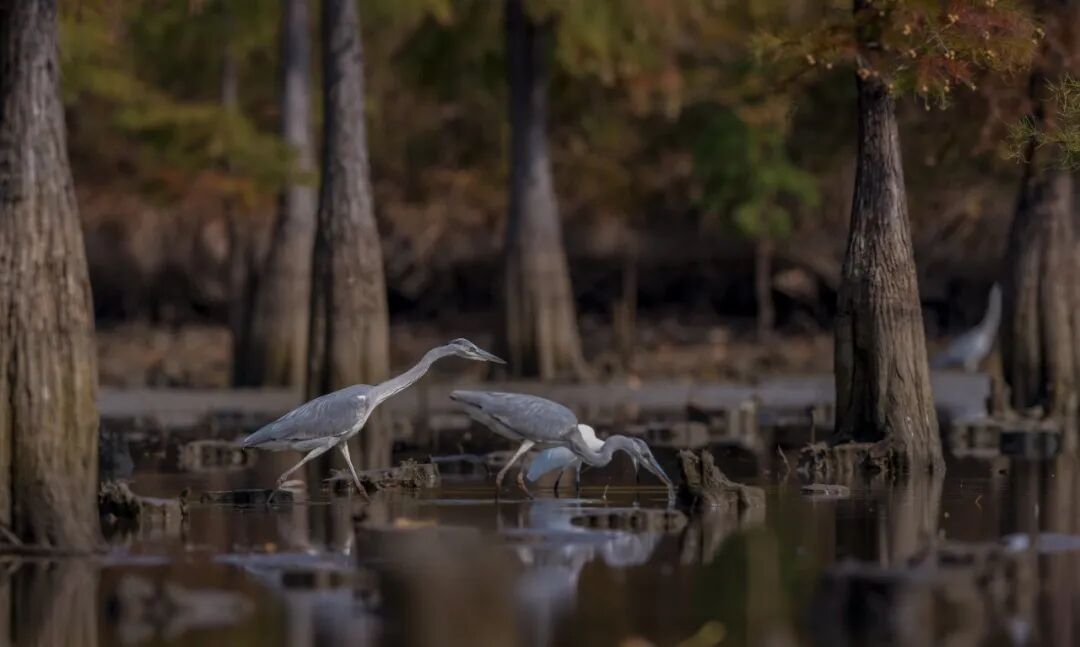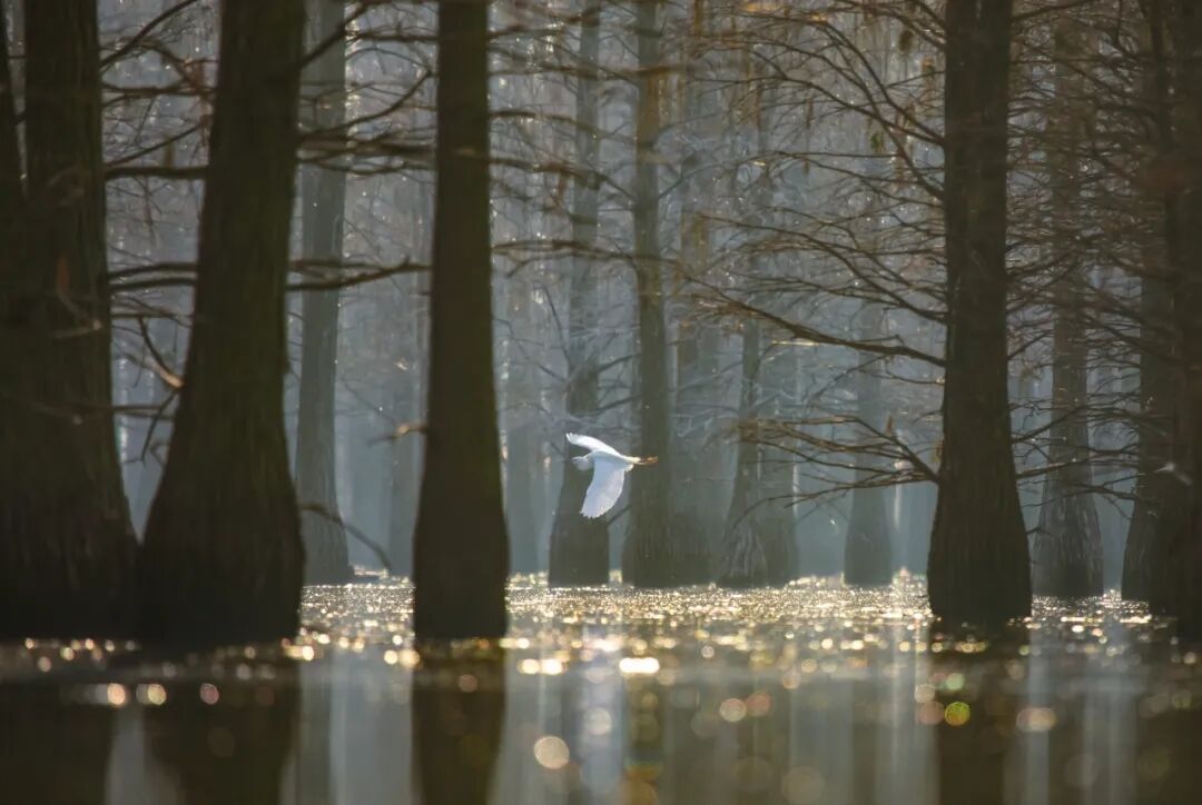 这里生态好、食物足,苍鹭家族“人数”壮大到几千只。它们常站在大池杉林的浅水区,像优雅的“白衣绅士”,一动不动地等待猎物,偶尔展翅掠过湖面,划出一道优美的弧线。